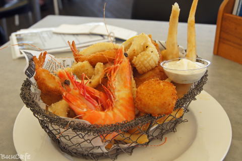 一番下はチップス、そしてホタテフライ、エビフライ、イカ、ガーリック味のエビ春巻き。ローカルプロウンも2尾付いてきてお得感がありました。
