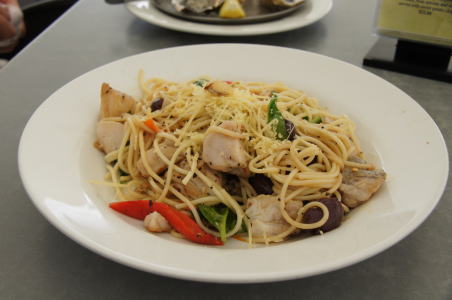 シーフードパスタ。あっさり味。やっぱり味が落ちたかな~。まとめ茹で??